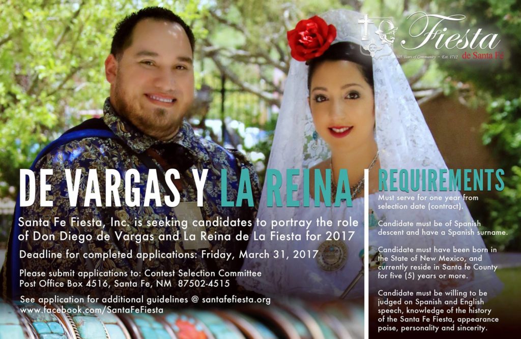 Be a part of history. Santa Fe Fiesta, Inc. is currently seeking candidates to portray the roles of General Don Diego de Vargas y La Reina de La Fiesta de Santa Fe. The deadline to submit your application is 5 PM Friday, March 31, 2017. For application details please visit the Santa Fe Fiesta Council website.