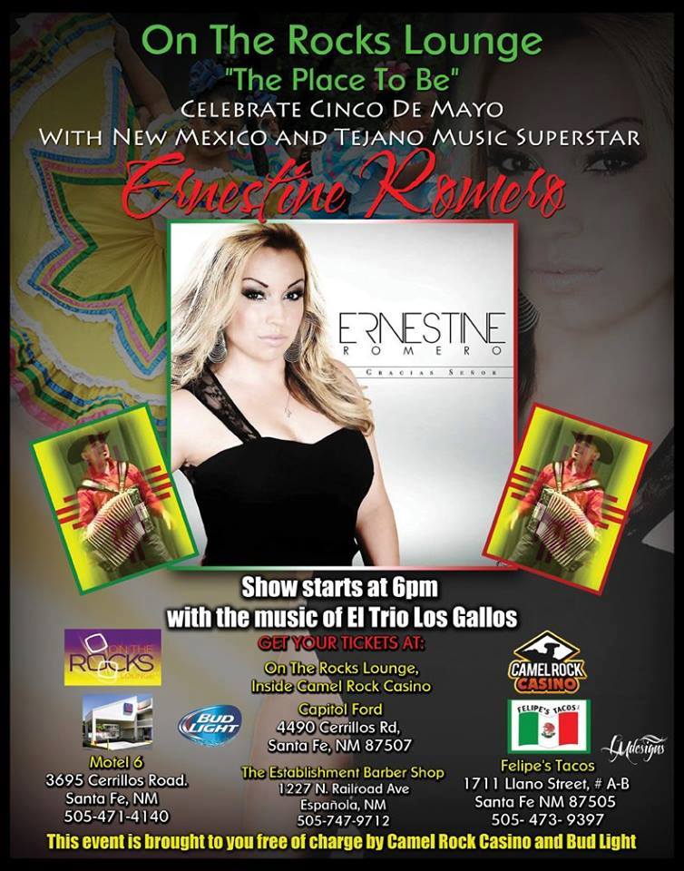 Cinco de Mayo with Ernestine Romero at Camel Rock Casino Ernestine Romero & Trio Los Gallos at On The Rocks Lounge 6pm Share Facebook Twitter