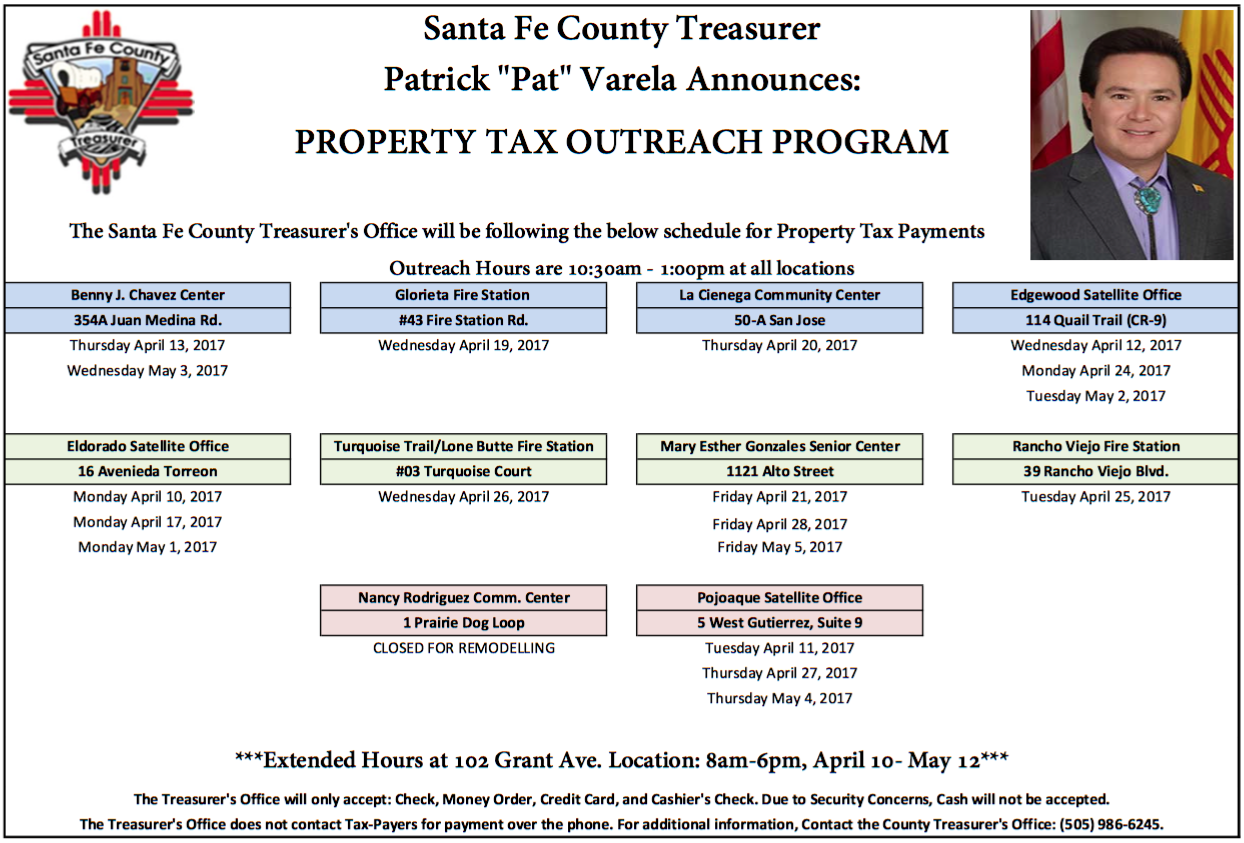 Santa Fe County Treasurer, Patrick “Pat” Varela, extends business hours by one hour during the second half of property tax collections (extended hours started on Monday, April 10, 2017 and will run through Friday, May 12, 2017 . During tax collections the Treasurer’s Office will be open from 8 a.m. – 6 p.m. Residents can also pay their property taxes at the Treasurer’s Office, 102 Grant Ave., Santa Fe, NM 87501, online, via mail using the return envelope provided or drop them in the “drop box” located at the front of the County Administration Building, 102 Grant. Ave., Santa Fe, NM 87501.