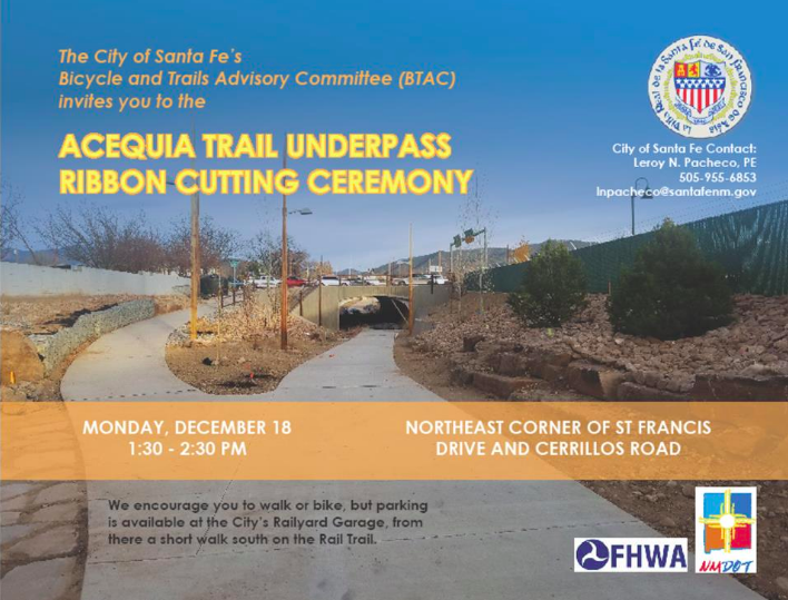 On behalf of City of Santa Fe, the Acequia Trail Underpass at St. Francis Drive is completed. The Grand Opening & Ribbon Cutting will be held on Monday, December 18, 2017 at 1:30 PM.