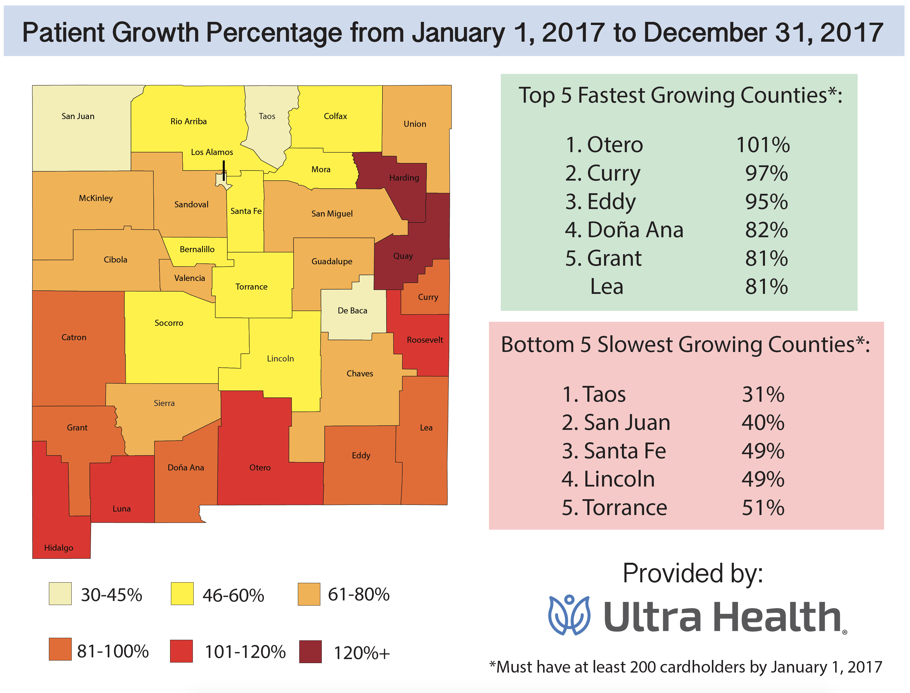 (Albuquerque) – Patient enrollment in New Mexico’s Medical Cannabis Program hit 46,645 as of December 31, 2017, finishing the year with a 61 percent increase over the January 1, 2017 cardholder numbers. The New Mexico medical program appears to be growing at nearly twice the pace of neighboring Arizona.