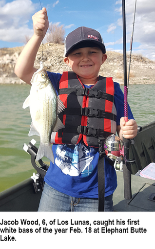 ◦ Elephant Butte Lake: Jacob Wood, age 6, of Los Lunas, caught his first white bass of the year Feb. 18. He was using white curly tail grubs and spoons.