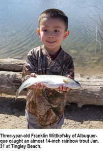 Tingley Beach: Franklin Wittkofsky, 3, of Albuquerque, caught an almost 14-inch rainbow trout Jan. 31. He was fishing with a wax worm.
