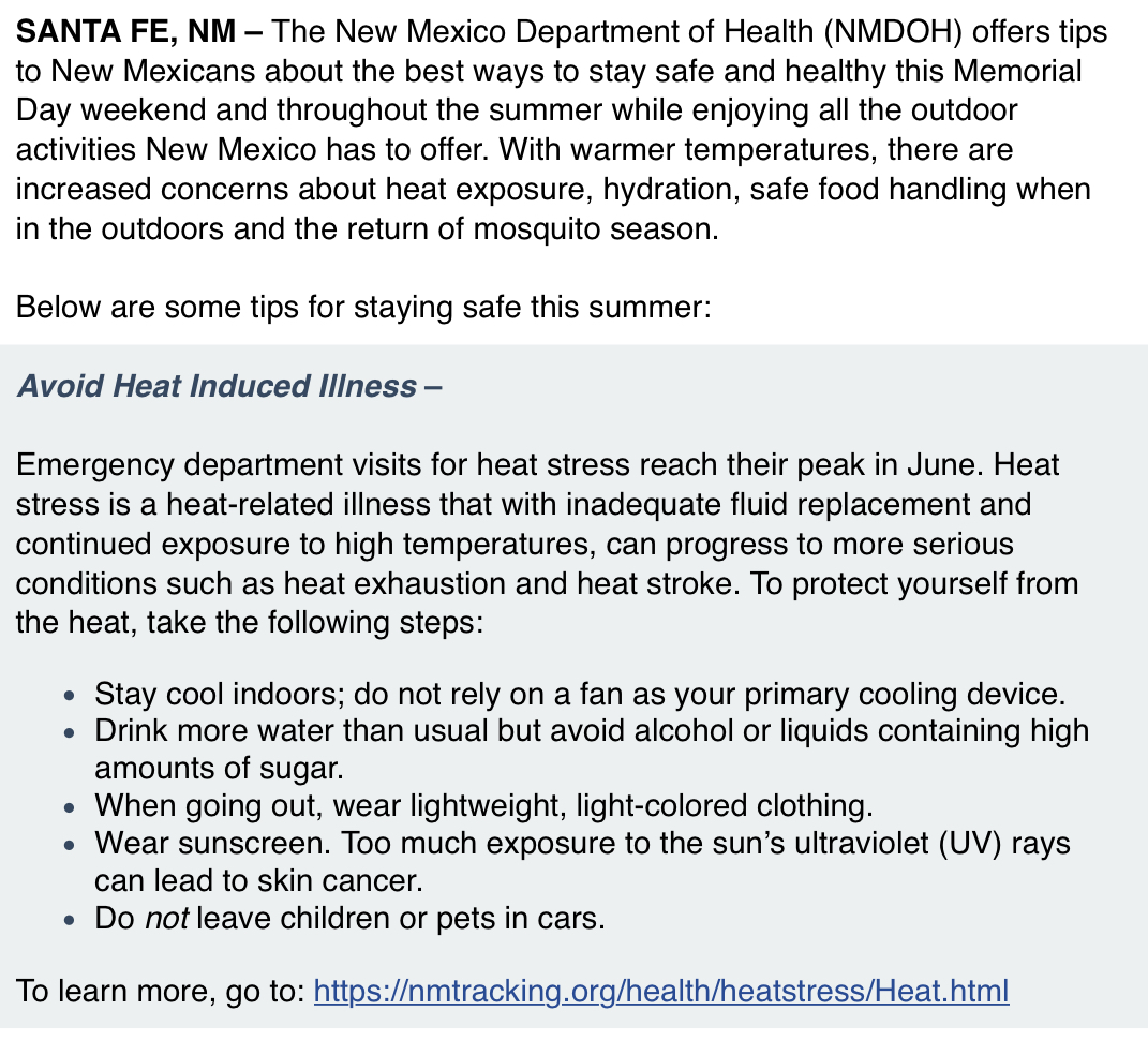 Department of Health Reminds New Mexicans of Best Ways to Stay Healthy and Safe While Enjoying the Outdoors