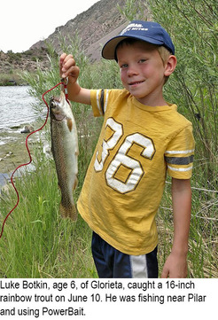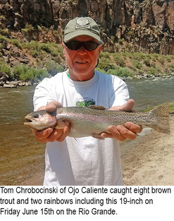 Rio Grande River: Tom Chrobocinski of Ojo Caliente caught eight brown trout and two rainbows including this 19-inch on Friday June 15th on the Rio Grande in the John Dunn Bridge area. Luke Botkin, age 6, of Glorieta, caught a 16-inch rainbow trout June 10. He was fishing near Pilar and using PowerBait.