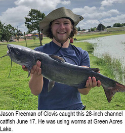 Greene Acres Lake: Jason Freeman of Clovis caught a 28-inch channel catfish June 17. He was using worms.