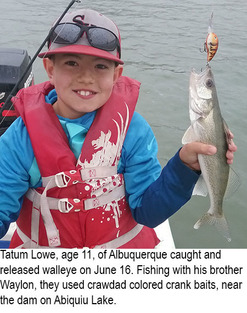 Clayton Lake: Leroy Sina of Raton caught a 9.5-pound walleye June 9. He was using night crawlers. Anthony Navarette of Dalhart, Texas caught a 4.12-pound largemouth bass June 9. He was using worms.