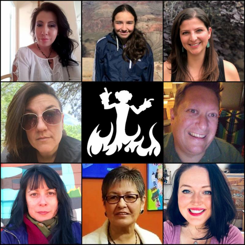 Cristina Gallegos (center L) is a modern pop artist in New Mexico. Some of her influences are Roy Lichtenstein and Banksy, and she is also a fan of New Mexico based artists Ricardo Caté and Elizabeth Jose. Her media includes acrylic painting, mixed media, photography, costume design, and jewelry design. Her various career paths have influenced her art, from the front and back of house in restaurants to managing Party Pits on the Las Vegas Strip. Cristina and her wife Ryan can be seen all over the Land of Enchantment on adventures with their two dogs.