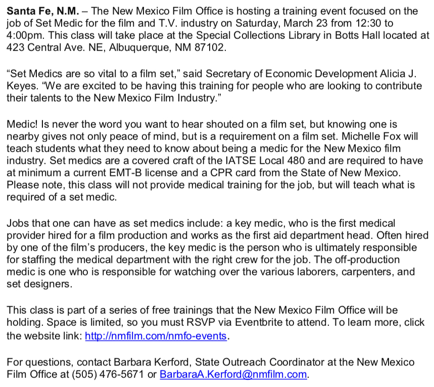 New Mexico Film Office Training Series: Set Medic for the Film & T.V. Industry Related Articles Seeking Los Alamos-Area Volunteers for Trail Work Day Sept. 26 September 23, 2020 All in Gods timing May 2, 2020 Good sign for churchgoers in the United States as church bells are now ringing May 2, 2020 By The NM Film Office Share Facebook Twitter