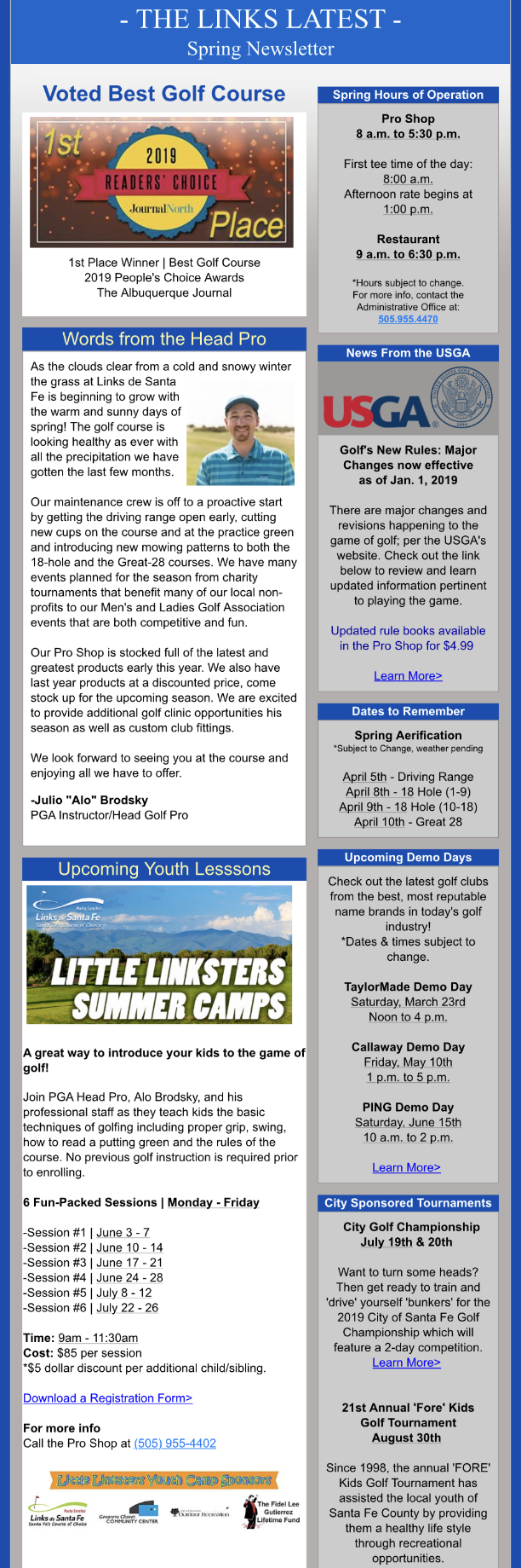 THIS JUST IN! The Links Latest Spring Edition! Related Articles Seeking Los Alamos-Area Volunteers for Trail Work Day Sept. 26 September 23, 2020 All in Gods timing May 2, 2020 Good sign for churchgoers in the United States as church bells are now ringing May 2, 2020 By City of Santa Fe Marty Sanchez Links de Santa Fe Golf Course Share Facebook Twitter