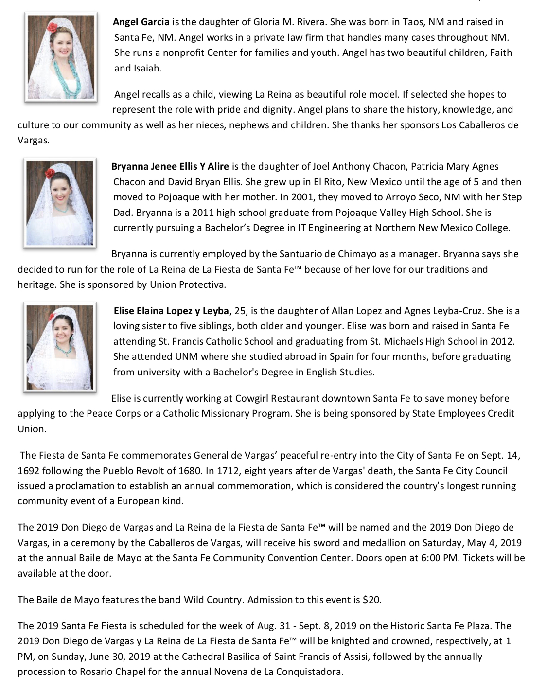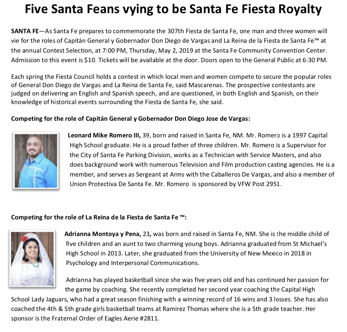 2019 Santa Fe Fiesta, Inc. Candidates for the roles of Don Diego de Vargas y La Reina de La Fiesta de Santa Fe By 2019 Santa Fe Fiesta INC Share Facebook Twitter